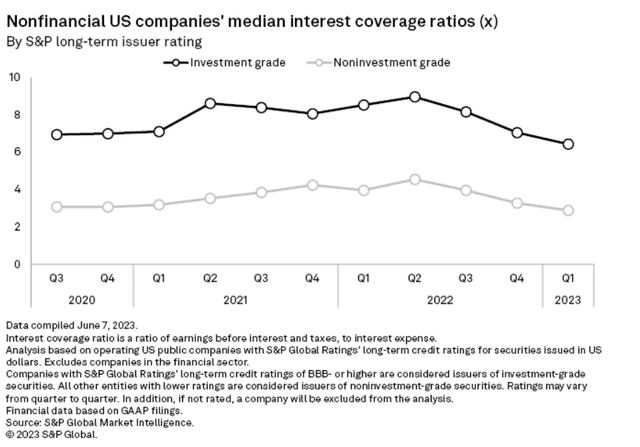 在这方面值得关注的一个关键指标是所谓的利息覆盖率。利息覆盖率是衡量公司产生的税前利润能否支付当期利息的指标,该比率基本上是一个风险提示指标,特别是在公司经历业绩低谷,自由现金流脆弱的时期更为关键,它可以说明公司是否还有能力支付利息以避免偿债风险,以及是否还有融资能力来扭转困境。目前,企业的利息覆盖率一直在缓慢下降。