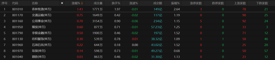 盘面上,31个申万一级行业中共计9个行业板块收涨。农林牧渔、交通运输、公用事业、煤炭、非银金融等行业板块涨幅居前。下跌方面,计算机、电力设备、电子、国防军工等行业板块跌幅居前。