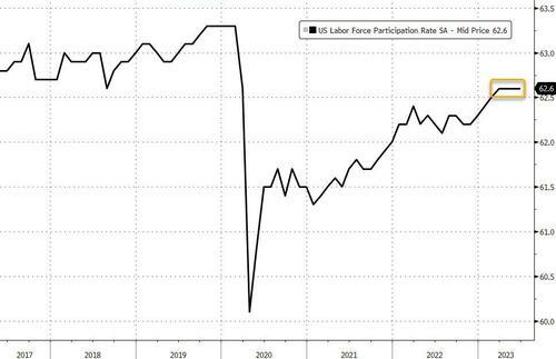 具体来看,被视为解决劳动力供需之间巨大失衡的关键指标——劳动力参与率(即已有工作或正在积极找工作的人口比例)连续第四个月稳定在62.6%,仍远低于2020年2月疫情爆发之前63.3%的水平,这在很大程度上反映了美国人口老龄化,并引发了持续的劳动力短缺。