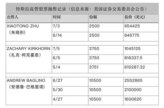 除了朱晓彤,特斯拉另外两位高管最近3个月也在频繁抛售股票,而此前三年并未出现过类似情况。