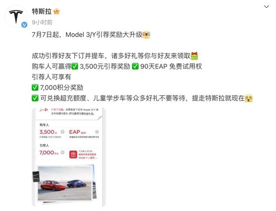特斯拉官方微博最新宣布,7月7日起升级对Model 3/Y的引荐奖励,成功引荐好友下单并在有效期内提车,即可赢得专属权益礼包。对购车人来说,奖励包括3500元引荐奖励(可用于抵扣车辆尾款)和增强版自动辅助驾驶功能(EAP)90天免费试用。