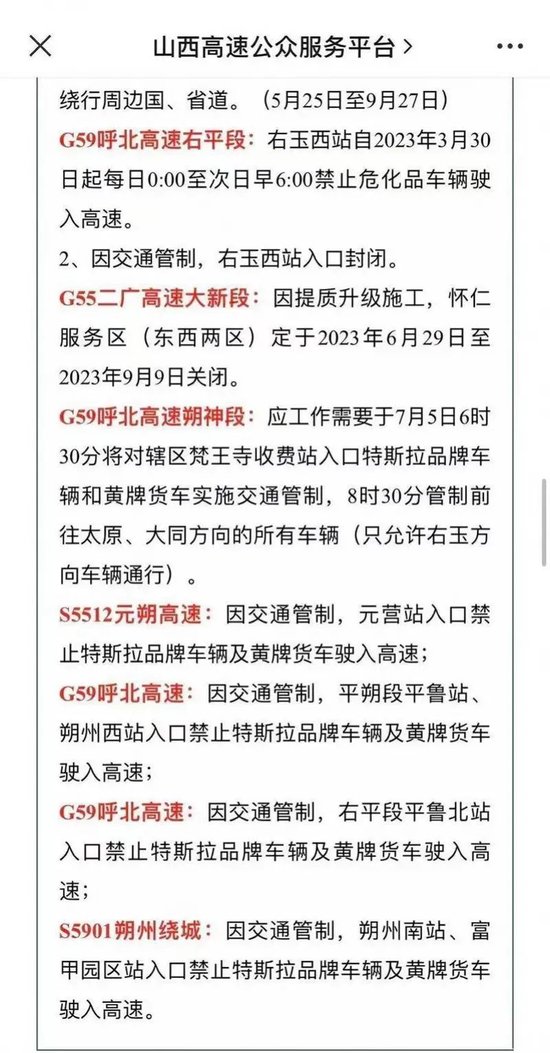 近日有网友反映,在山西省高速公路信息监控中心官方发布的高速实时路况信息中,部分高速路段禁止特斯拉品牌车辆驶入,引发热议。
