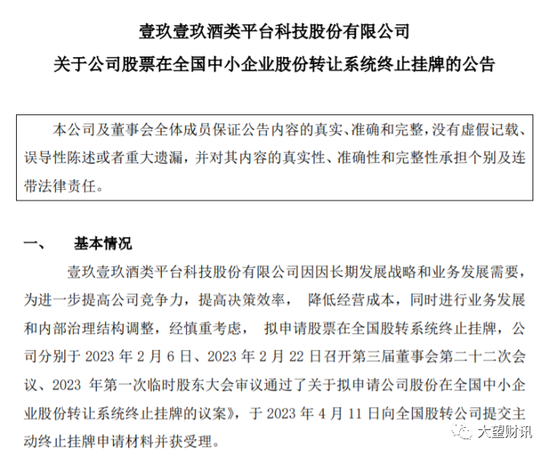 近日,壹玖壹玖发布公告称,公司于2023年4月11日向全国股转公司提交主动终止挂牌申请材料并获受理。根据《全国中小企业股份转让系统挂牌公司股票终止挂牌实施细则》的规定,全国股转公司同意公司股票自2023年6月30日起终止在全国中小企业股份转让系统挂牌。