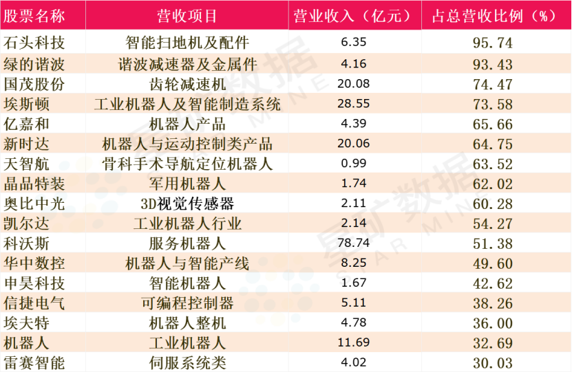 另据星矿数据梳理,其中,机器人业务占营收比例排名前三的A股上市公司分别为石头科技、绿地谐波和国茂股份,具体比例分别高达95.74%、93.43%和74.47%。另外,机器人业务占营收比例超50%的上市公司还有埃斯顿、亿嘉和、新时达、天智航、晶品特装、奥比中光、凯尔达和科沃斯,具体详见下表: