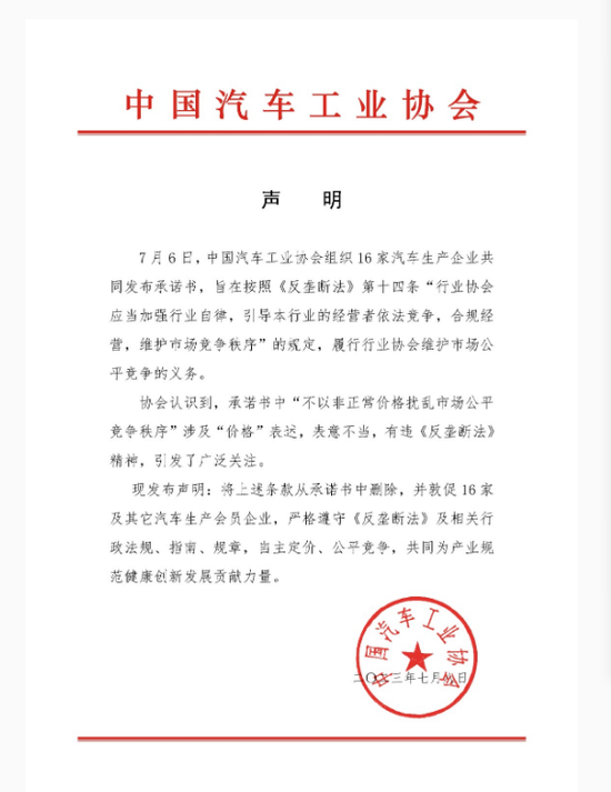 日前,中国汽车工业协会组织蔚来、理想等16家汽车生产企业签署了《汽车行业维护公平市场秩序承诺书》。8日该协会在官网发布声明称,此前的承诺书中“不以非正常价格扰乱市场公平竞争秩序”涉及“价格”表述,表意不当,将上述条款从承诺书中删除。并敦促16家及其它汽车生产会员企业,严格遵守《反垄断法》及相关行政法规、指南、规章,自主定价、公平竞争,共同为产业规范健康创新发展贡献力量。