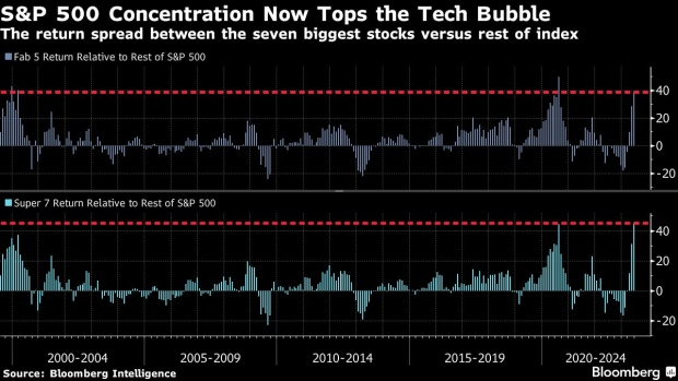 然而,这种担忧似乎为时过早。Bloomberg Intelligence(简称BI)的分析显示,历史上也有类似的“狭隘时期”,包括世纪之交的科技泡沫,规模更大、持续时间更长。今年的飙升也可以被视为2022年暴跌的逆转,而不是出现“末日”的预兆。