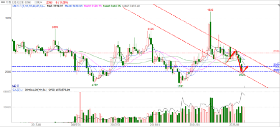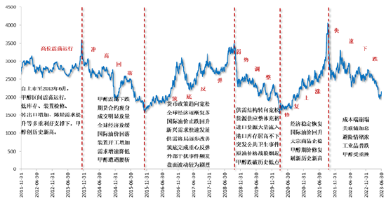 甲醇属于高耗能行业,碳中和碳达峰影响下,行业开工受到一定限制。此外,上游煤炭价格持续拉涨,成本端提供利好刺激。2021年旺季行情再度显现,甲醇迎来强势反弹,重心不断攀升,成功突破2013年高点,并进一步上破4000整数大关,最高触及4235,创上市以来新高。受到政策层面的影响,上游煤炭市场价格出现明显回落,成本端拖累下,甲醇期货市场价格触顶。随着国内大宗商品市场普遍下跌,市场避险情绪进一步加剧,甲醇盘面恐慌性下挫,连续跳空低开,并多次出现跌停。连续下调八个交易日后,甲醇重心跌破3000整数大关,回到行情启动前的平台期。到2021年11月中旬,甲醇跌势逐步放缓,经历了大涨大跌行情,期价进入震荡筑底阶段。2022年,保供稳价主基调下,成本端支撑乏力,煤化工板块一蹶不振,甲醇继续整理运行。受到宏观大环境的影响,甲醇市场需求端恢复不及预期。美联储持续加息利空大宗商品,2023年甲醇重心继续松动,一路下行,跌破2000整数关口。