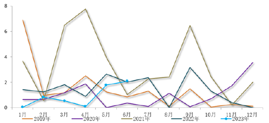 甲醇出口呈现缩减态势,在全球经济衰退和美联储就加息大背景下,出口市场进一步转弱。从近五年月度出口量对比看,2023年甲醇出口处于偏低水平。统计数据显示,1-5月份我国累计出口甲醇3.36万吨,与去年同期的7.79万吨相比,大幅缩减4.61万吨,同比下滑57.84%,不及去年同期出口量的一半般。预计6月份甲醇出口进一步增加,有望达到2.10万吨左右,上半年总出口量接近5.46万吨,我国出口甲醇主要流向新加坡和印度尼西亚。下半年美联储仍存在加息预期,海外需求依旧不佳,甲醇出口难有改善。