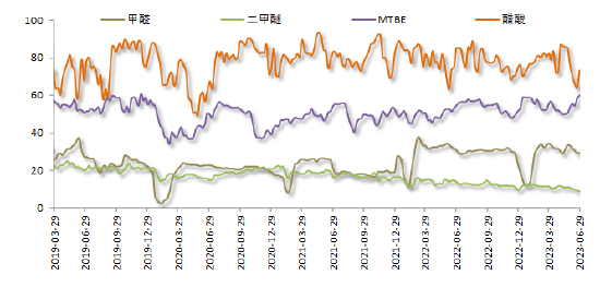 2023年上半年,甲醇需求端表现远不及市场预期,下游行业平均开工水平跟去年同期相比,除了MTBE外,均出现下滑,尤其是煤制烯烃下滑较为明显。今年上半年,煤制烯烃行业平均开工率为77.04%,但与2022年同期相比回落7.54个百分点,也处于近五年同期的低位。传统需求行业中,MTBE表现尚可,处于近五年相对高位。二甲醚和甲醛产能利用率偏低,均不足三成。分别来看,2023年上半年醋酸平均开工水平为77.50%,MTBE平均开工水平为54.51%,甲醛平均开工水平为28.34%,二甲醚平均开工水平为10.86%,与2022年同期相比,醋酸、甲醛和二甲醚平均开工均回落,仅有MTBE提升4.97个百分点。