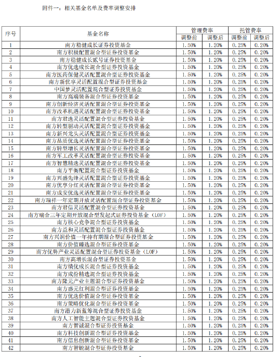 1、根据相关法律法规和基金合同的约定,本公司决定调低旗下部分基金的管理费率及 托管费率,并对相关基金合同进行必要的修订。相关基金的名单及费率调整情况参见附件, 相关基金的托管协议、招募说明书、基金产品资料概要据此相应进行必要修订。