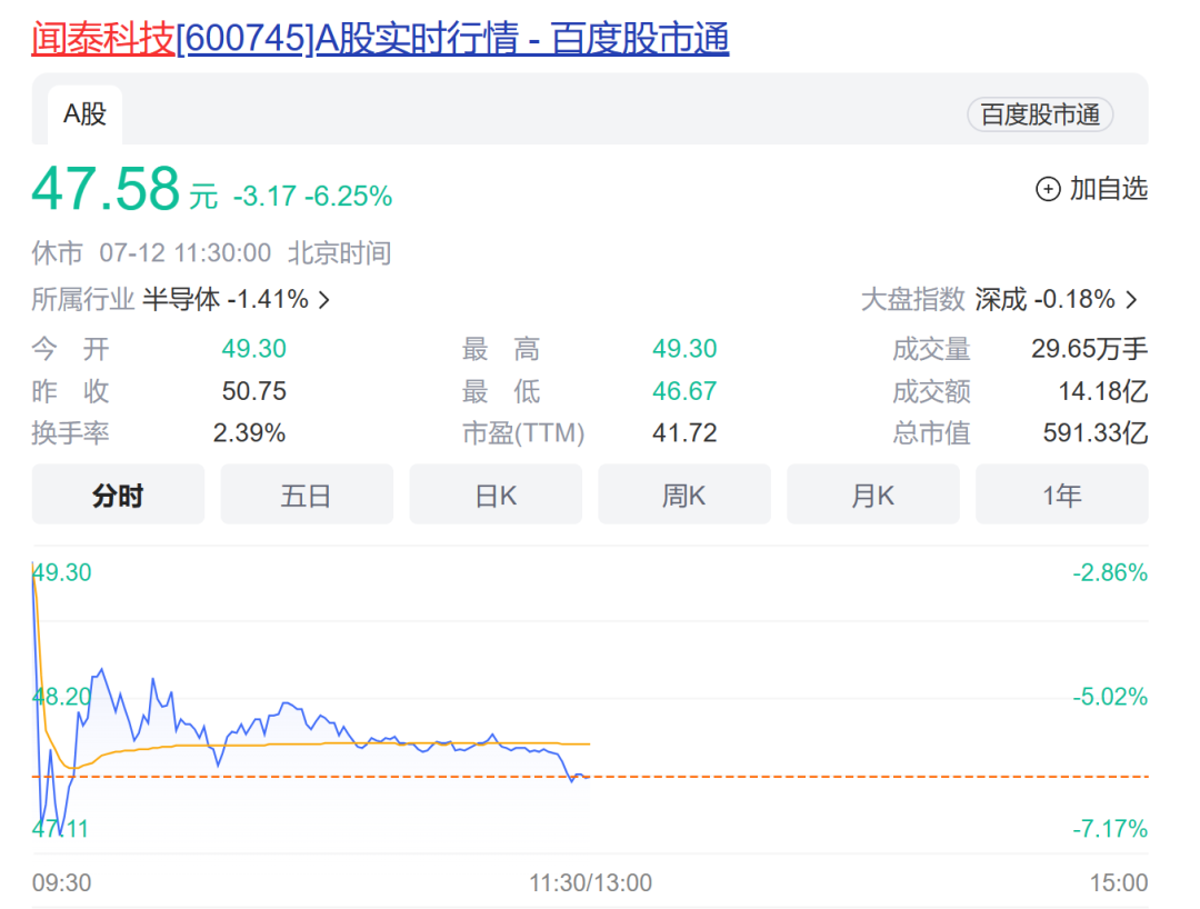 截至午间收盘,闻泰科技股价下跌6.25%,报收47.58元/股。