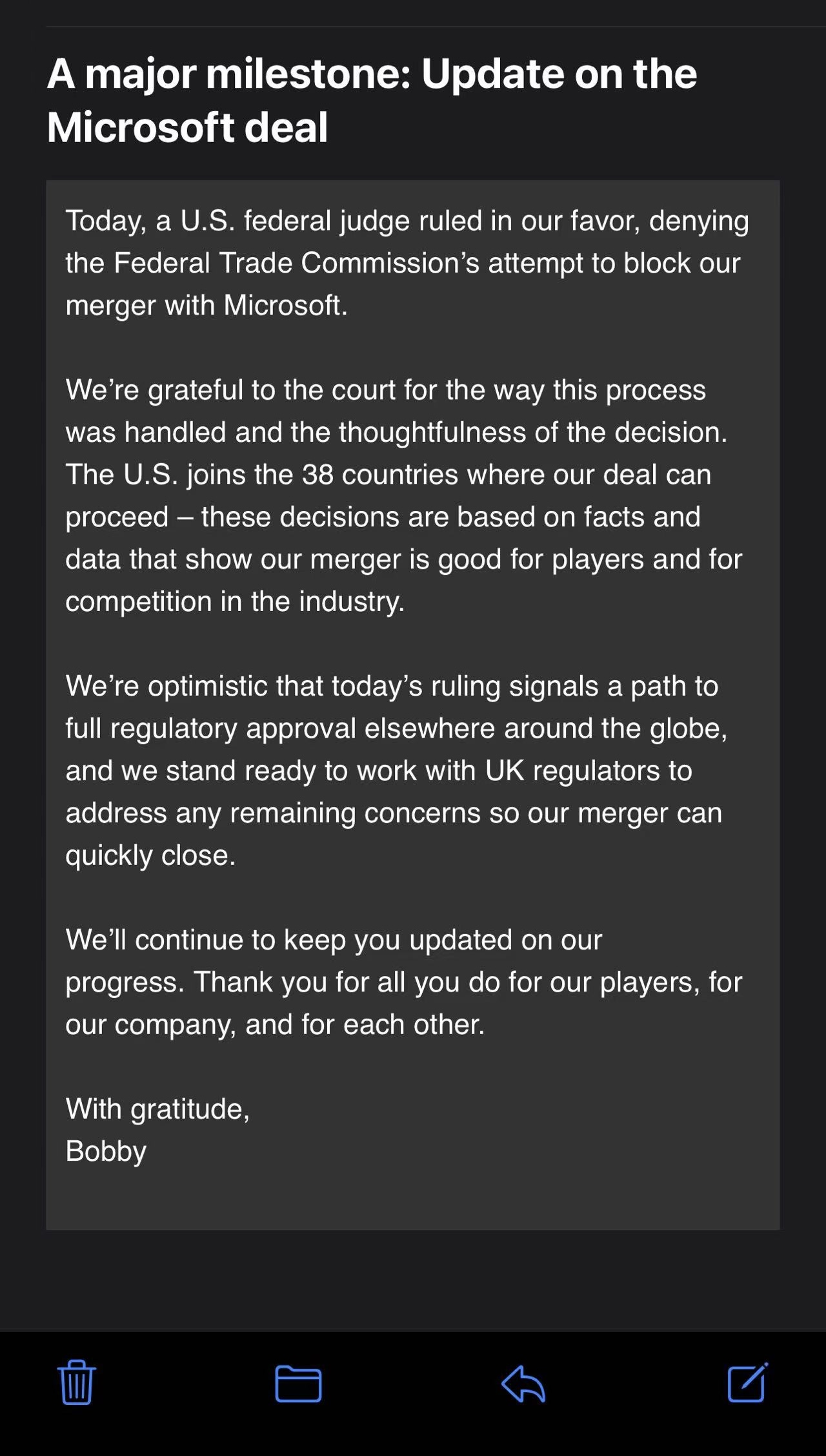 第一财经也获悉一份由动视暴雪CEO Bobby Kotick发布的全员信,他提到,一位美国联邦法官做出了有利的裁决,驳回了FTC阻止与微软合并的企图,美国进入了收购交易可以进行的38个国家行列。