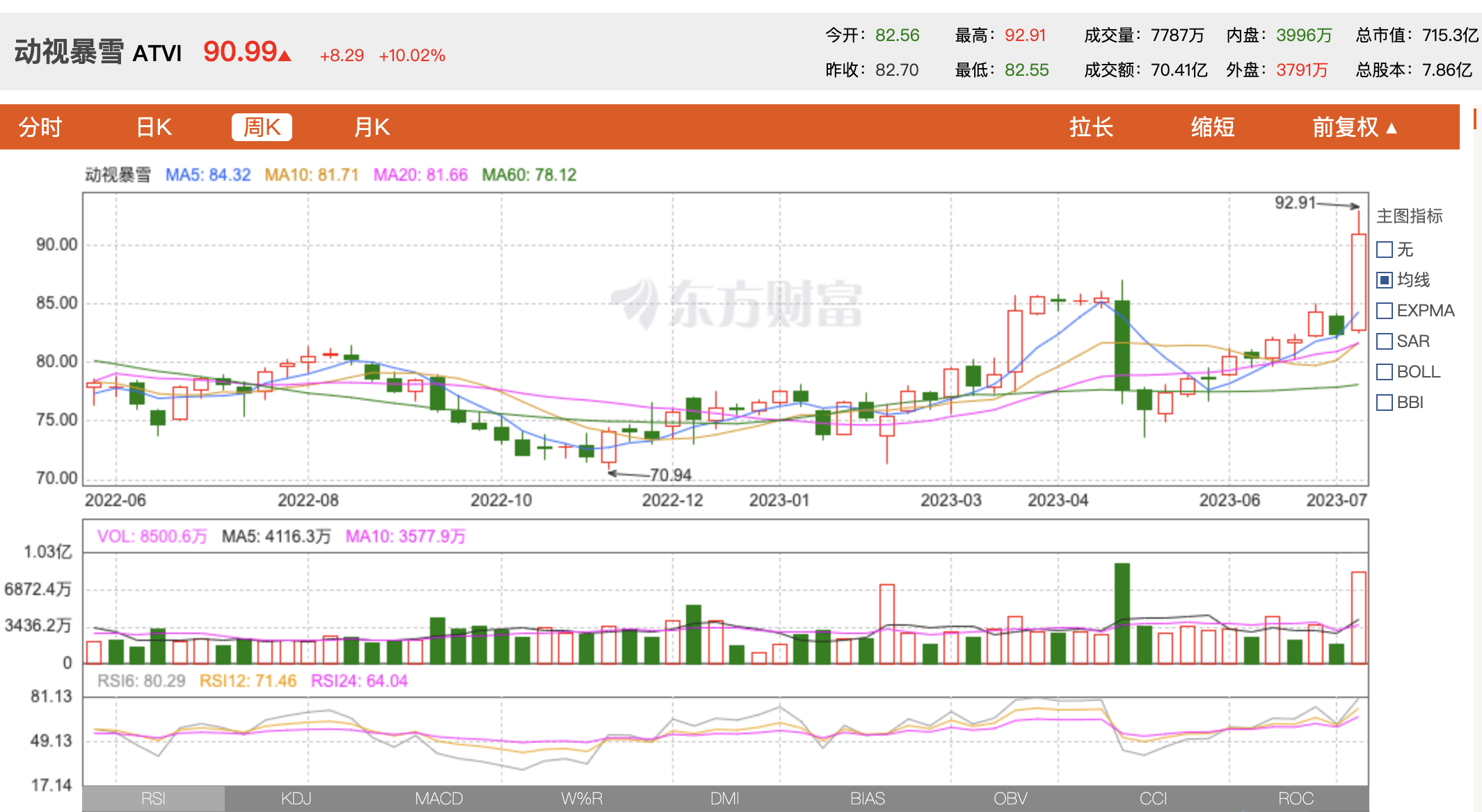 7月11日晚,微软获得美国法院许可,得以继续推进以690亿美元收购动视暴雪公司的交易。受此消息提振,动视暴雪昨夜跳涨10.02%,报收90.99美元/股,创近两年新高,其市值一夜增加65亿美元(约合人民币469亿元),目前总市值715.3亿美元。