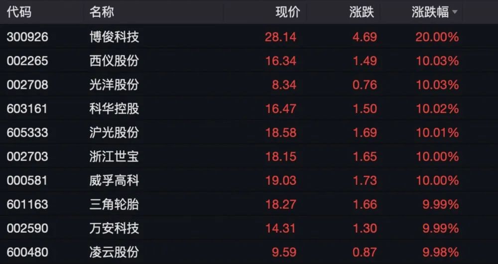 汽车产业链个股持续活跃,博俊科技20cm涨停,浙江世宝、万安科技、神通科技等超10股涨停。