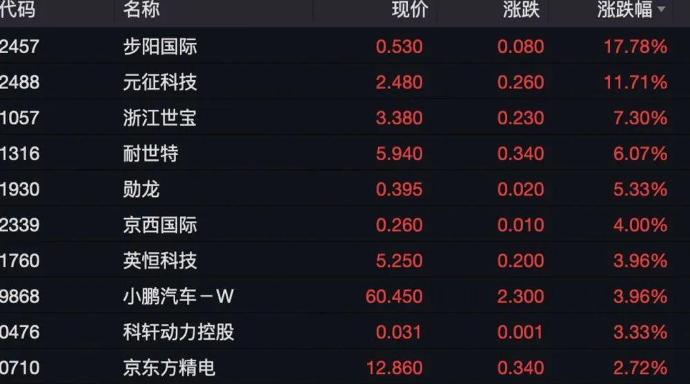 港股方面,步阳国际、元征科技涨超10%,浙江世宝涨超7%,小鹏汽车涨近4%,理想汽车涨超2%。