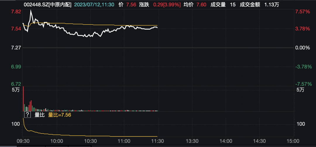中原内配今天上午盘中涨幅一度超过7%,后涨幅有所收窄。