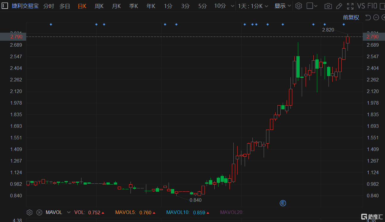 格隆汇7月12日丨捷利交易宝(8017.HK)再度拉升涨超5%,最高报2.82港元再度刷新上市新高价,5月中旬以来累计飙升220%,目前总市值16.6亿港元。