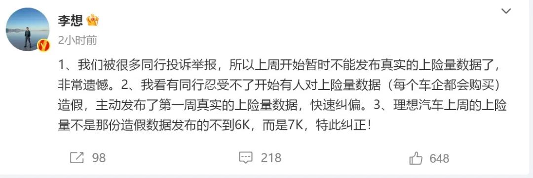 5月15日,理想汽车董事长兼CEO李想在社交媒体发文称,“我们被很多同行投诉举报,所以上周(5月8日~5月14日)开始暂时不能发布真实的上险量数据了,非常遗憾。我看有同行忍受不了开始有人对上险量数据(每个车企都会购买)造假,主动发布了第一周真实的上险量数据,快速纠偏。”