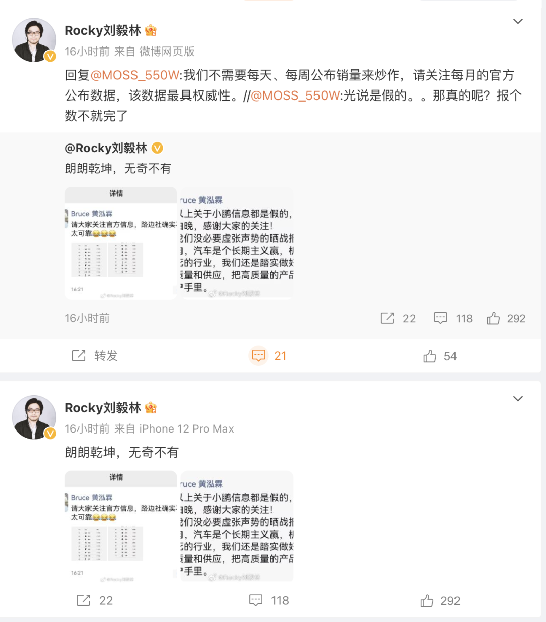 对此,网友纷纷表达自己的观点。有网友称:“光说是假的。那真的呢?报个数不就完了。”刘毅林则回复称:“我们不需要每天、每周公布销量来炒作,请关注每月的官方公布数据,该数据最具权威性。”