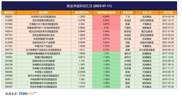 个股上涨,新能源汽车主题基金随即领涨两市,通联数据显示,7月11日,东吴阿尔法灵活配置混合(000531)以4.99%的涨幅领涨。
