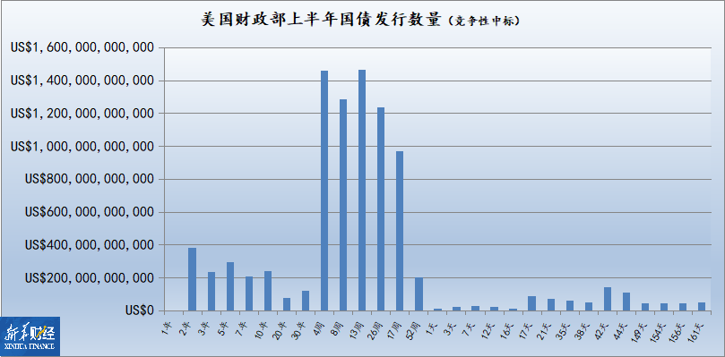 新华财经北京7月13日电(李奇涵)截至6月30日,美国财政部上半年发行各期限国债逾9万亿美元(不含非竞争性招标,下同),同比大幅增长23%。从债券类型来看,4周-52周短期国债(T-Bill)发行量最大,其次是2年-30年期中长期国债(Notes&Bonds),再次是现金管理国库券(CMB)。
