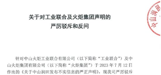 7月14日,宝能系旗下中山润田发布《关于对工业联合及火炬集团声明的严厉驳斥和反问》,主要针对火炬集团7月12日发布的《关于中山润田发布不实信息的严正声明》。