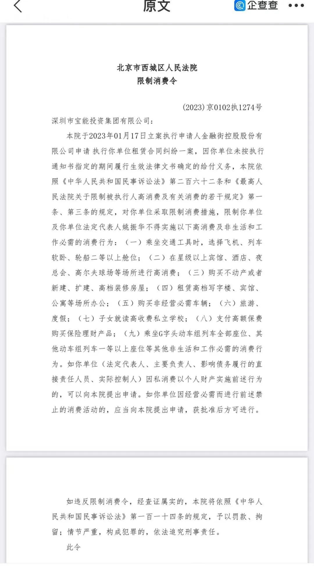 早在今年2月,宝能集团董事长姚振华在“宝能集团2023新年开工大会”上表示,2023年将是宝能迈进下一个三十年辉煌征程的崭新起点,也将是宝能汽车战略提速的决胜之年。但企查查显示,近日,深圳市宝能投资集团有限公司新增2条被执行人信息,执行标的合计4.27亿余元。风险扫描显示,深圳市宝能投资集团有限公司存在超80条被执行信息,被执行总金额超398亿元,姚振华则被限制高消费。