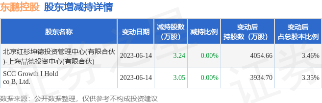 7月16日东鹏控股发布公告《东鹏控股:关于公司股东减持计划期限届满暨实施情况的公告》,其股东北京红杉坤德投资管理中心(有限合伙)-上海喆德投资中心(有限合伙)、SCC Growth I Holdco B, Ltd.于2023年3月23日至2023年6月14日间合计减持6.29万股,占公司目前总股本的0.0054%,变动期间该股股价下跌7.79%,截止6月14日收盘报8.41元。