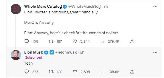 不过,马斯克的这一言论引发了他的一位忠实粉丝的调侃,并举了推特最近启动创作者广告收入分成的例子,暗示马斯克这是在花式炫富,先吐一顿苦水,然后立刻拿出真金白银来给人们“压惊”。