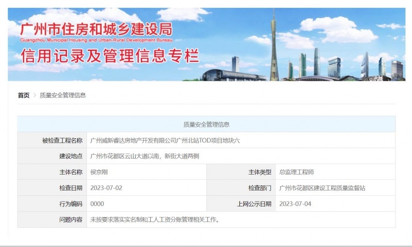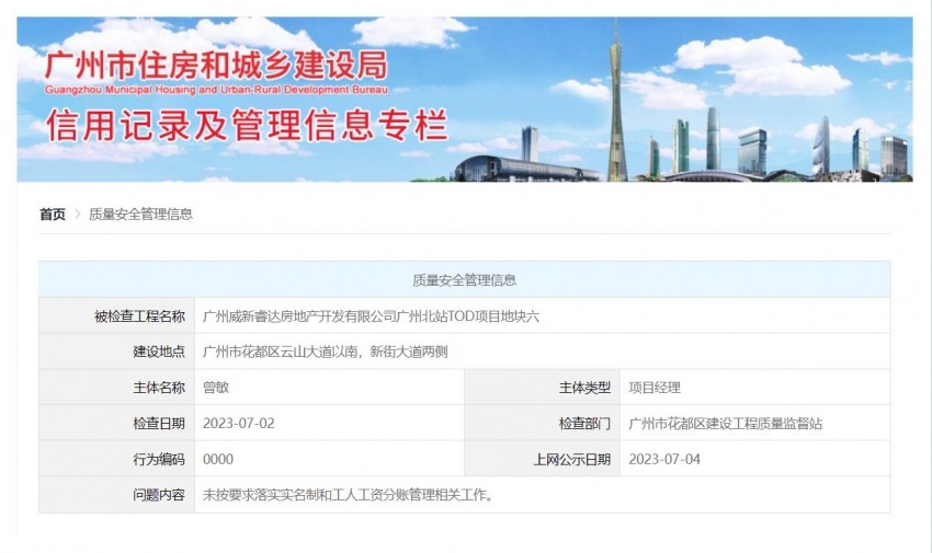 2023年7月4日,广州市住房和城乡建设局信用记录及管理信息专栏公示“广州威新睿达房地产开发有限公司广州北站TOD项目地块六”质量安全管理信息。