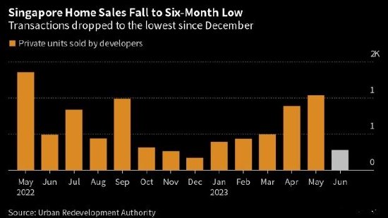 新加坡市区重建局周一公布的数据显示,6月份新建私人公寓的购买量从5月的1038套降至278套。这是自2022年12月以来的最低水平,当时由于供应紧张抑制了需求,售出了170套房屋。