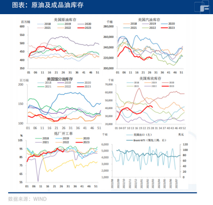 最近一周美国原油库存超预期上升,但主要因出口环比大幅下滑供需数据并未显著利空。下游炼厂开工率超预期上升,原油投入量增至2022年6月来最高水平,表明原油需求尚可,但市场对长期仍有下滑预期。