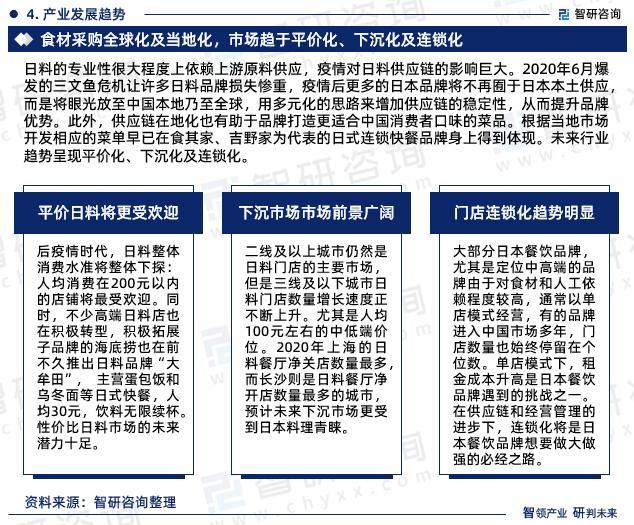 1、食材采购全球化,菜品创新化。日料的专业性很大程度上依赖上游原料供应,疫情对日料供应链的影响巨大。2020年6月爆发的三文鱼危机让许多日料品牌损失惨重,疫情后更多的日本品牌将不再囿于日本本土供应, 而是将眼光放至中国本地乃至全球,用多元化的思路来增加供应链的稳定性,从而提升品牌优势。此外,供应链在地化也有助于品牌打造更适合中国消费者口味的菜品。根据当地市场开发相应的菜单早已在食其家、吉野家为代表的日式连锁快餐品牌身上得到体现。