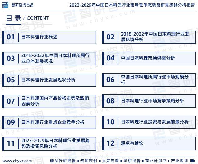 为方便行业人士或投资者更进一步了解日本料理行业现状与前景,智研咨询特推出《2023-2029年中国日本料理行业市场竞争态势及前景战略分析报告》(以下简称《报告》)。报告对中国日本料理市场做出全面梳理和深入分析,是智研咨询多年连续追踪、实地走访、调研和分析成果的呈现。