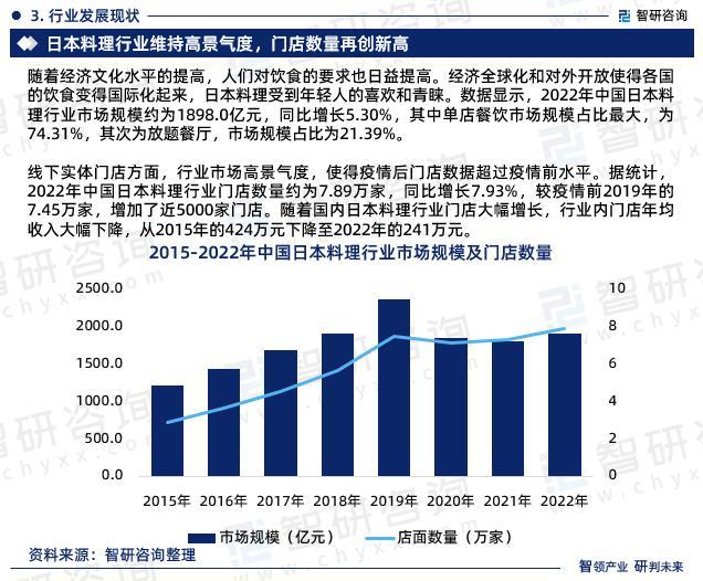 当今世界,随着经济文化水平的提高,人们对饮食的要求也日益提高。经济全球化和对外开放使得各国的饮食变得国际化起来,日本料理受到年轻人的喜欢和青睐,2015年-2019年市场规模持续增长,且维持较快的市场增速,2020年开始受到疫情的影响,国内线下餐饮业整体受挫,市场规模大幅下降,2022年市场规模仍未恢复至疫情前水平。数据显示,2022年中国日本料理行业市场规模约为1898.0亿元,同比增长5.30%,其中单店餐饮市场规模占比最大,为74.31%,其次为放题餐厅,市场规模占比为21.39%。