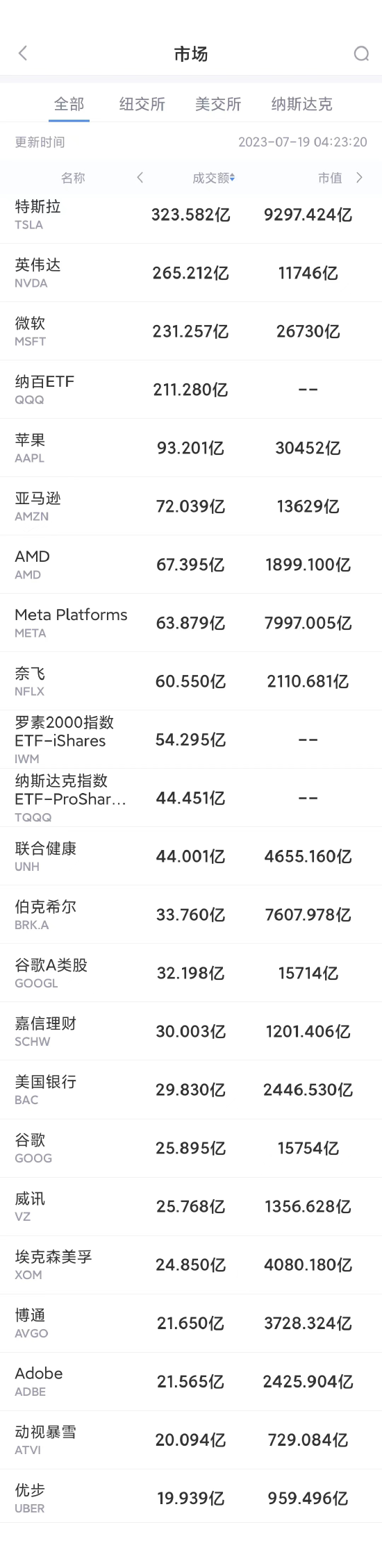 以下为美股当日交易最活跃的20只股票(按成交额):