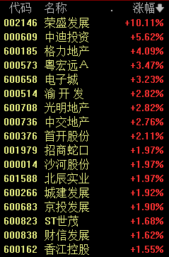 今天上午,房地产板块走势活跃,荣盛发展涨停,中迪投资、格力地产(维权)等涨幅居前。