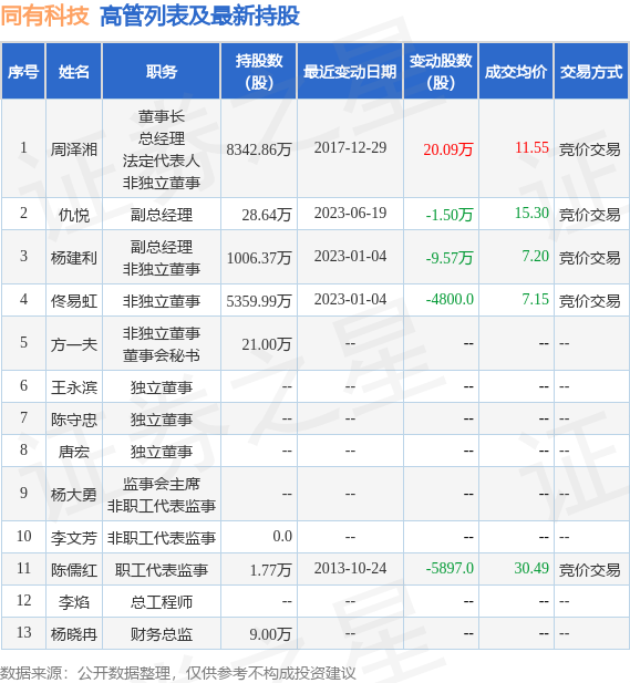 同有科技近半年内的董监高及核心技术人员增减持详情如下: