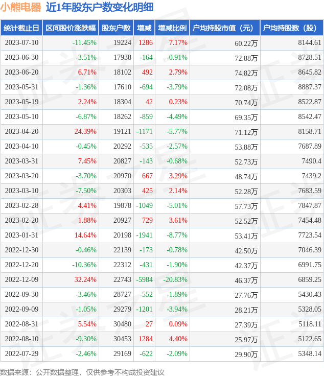 从股价来看,2023年6月30日至2023年7月10日,小熊电器区间跌幅为11.45%,在此期间股东户数增加1286.0户,增幅为7.17%。