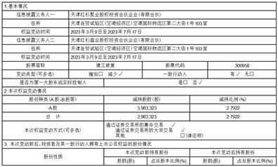 近日,公司收到持股5%以上股东红杉聚业和红杉盛业发来的《关于减持建工修复股份进展的告知函》,自2023年3月9日至2023年7月17日,红杉聚业、红杉盛业通过集中竞价交易及大宗交易方式减持公司股份3,983,323股,占公司目前总股本的2.7922%;红杉聚业、红杉盛业合计持股变动比例已达到公司已发行的有表决权股份比例的1%。截止2023年7月17日,红杉聚业、红杉盛业合计持有公司股票11,174,572股,占公司目前总股本的7.8332%。根据《深圳证券交易所创业板股票上市规则》、《深圳证券交易所上市公司股东及董事、监事、高级管理人员减持股份实施细则》等相关规定,现将有关情况公告如下: