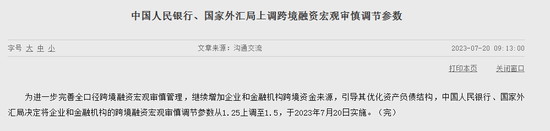 人民银行网站7月20日消息,为进一步完善全口径跨境融资宏观审慎管理,继续增加企业和金融机构跨境资金来源,引导其优化资产负债结构,中国人民银行、国家外汇局决定将企业和金融机构的跨境融资宏观审慎调节参数从1.25上调至1.5,于7月20日实施。