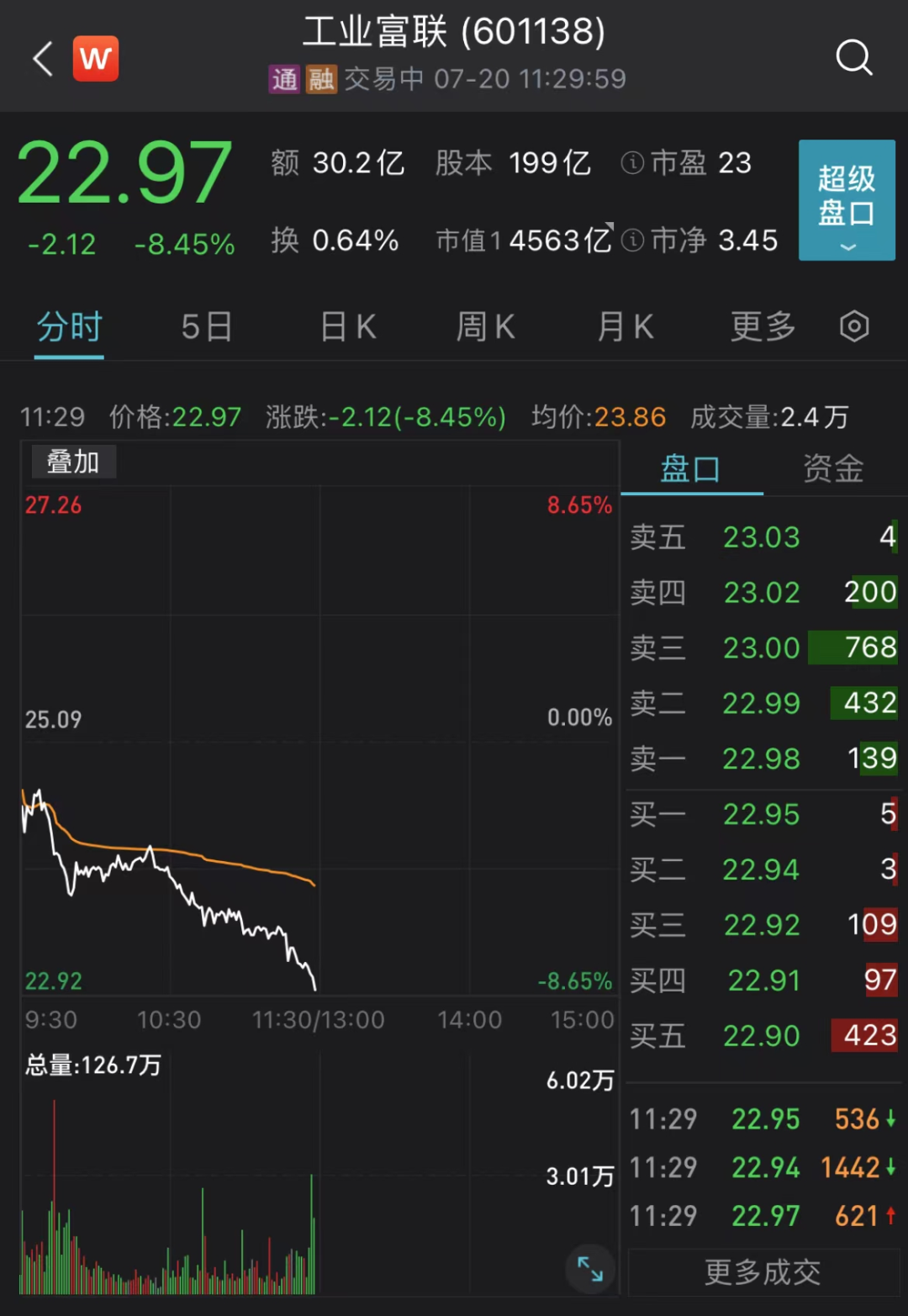 PCB、算力租赁、液冷服务器等板块也下跌。工业富联下跌8.45%,最新市值为4563亿元。