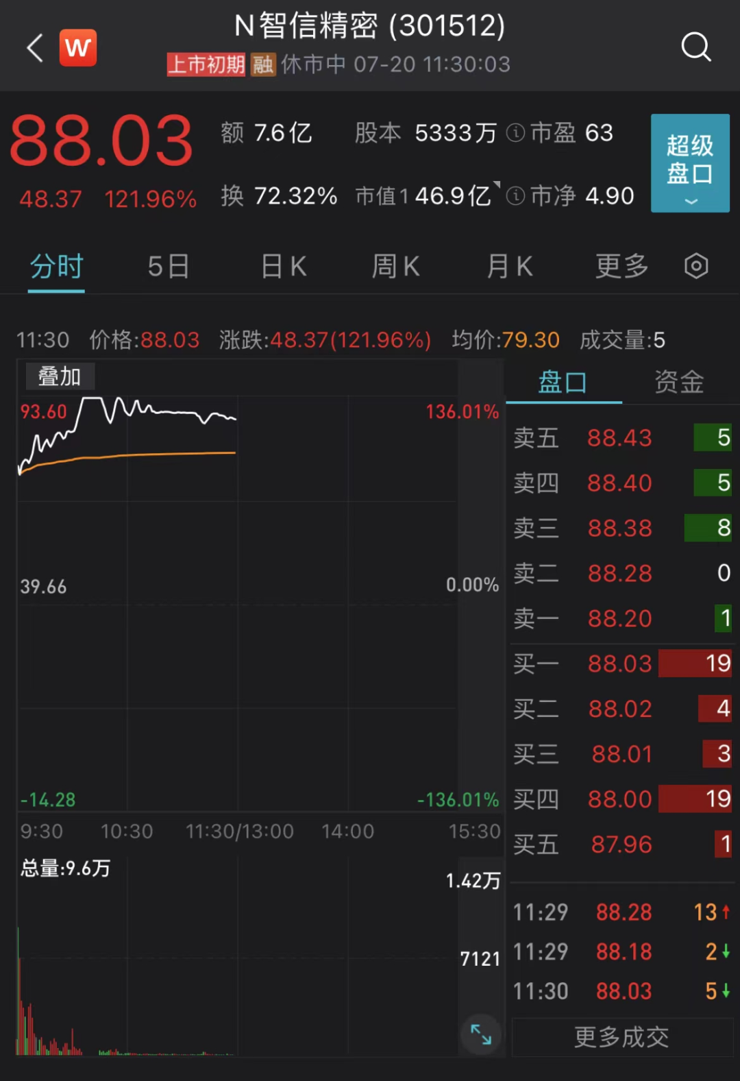 今天上午,N智信上涨121.96%,盘中最高涨至93.60元。若参照盘中最高价,相比发行价,中一签可赚26970元。