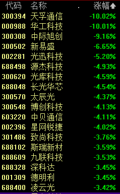 今天上午,AI大幅调整。应用端,昨天大涨的办公软件分化明显,福昕软件、新致软件等跌幅居前。硬件端,光模块板块大跌,华工科技、天孚通信等跌幅居前。