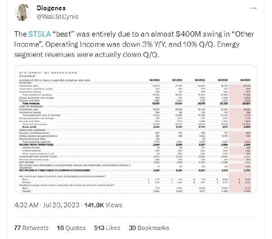 查诺斯指出,特斯拉盈利超预期完全是由于财报中“其他收益”部分近4亿美元的波动,从第一季度的负4800万美元扭转到第二季度的3.28亿美元。