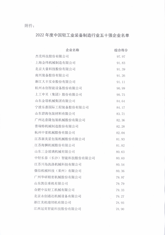 为加快建设制造强国,推动轻工装备制造业做大做强,本着严谨、公正、科学的原则,中国轻工业联合会组织开展了2022年度“中国轻工业装各制造行业五十强企业”统计评价工作。