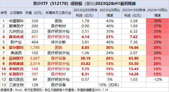 单季度来看,申万宏源证券预测的中证医疗13只成份股中有8只第二季度净利润预计实现20%以上增长,其中爱尔眼科、泰格医药、乐普医疗、华厦眼科等6家公司第二季度净利增速超过了上半年增速,反映业绩恢复势头向好。