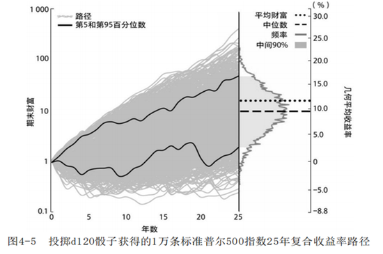 这张图表展示了什么呢?在所有可能的路径中,我们持有25年标普500指数的复合年均增长率(同几何平均收益率)中位数为9.5%,最坏情况下第5百分位数复合增长率为2.7%。其中显示的几何平均收益率计算的最大优点是避免了非遍历性问题,它反映并跟踪了你的资本基础随时间推移的演变情况。