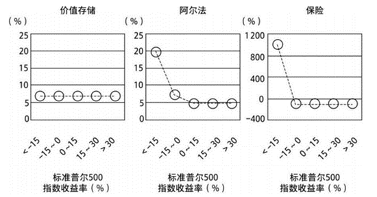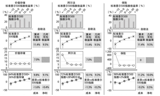 斯皮茨纳格尔在书里提出了三个风险缓释的手段。价值储存类似于年金等7%的固定收益投资;中间的阿尔法原型在暴跌时(标准普尔500指数全年下跌大于等于15%)获得20%的年化收益率,在第二个时期(标准普尔500指数下跌小于15%时)获得7.5%的年化收益率,在其他两个时期获得5%的年化收益率,类似CTA策略。它在暴跌时提供了一个很好的负相关性,并且总是正利差。保险顾名思义就是保险投资。