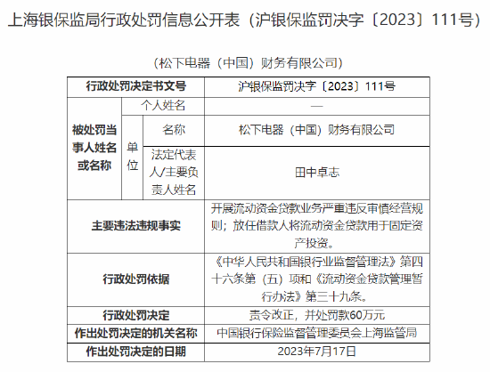 7月20日金融一线消息,据国家金融监督管理总局网站发布的行政处罚信息公开表显示,松下电器(中国)财务有限公司因开展流动资金贷款业务严重违反审慎经营规则、放任借款人将流动资金贷款用于固定资产投资,被处以责令改正,并处罚款60万元;此外,上田干男对上述行为负管理责任,被处以警告。